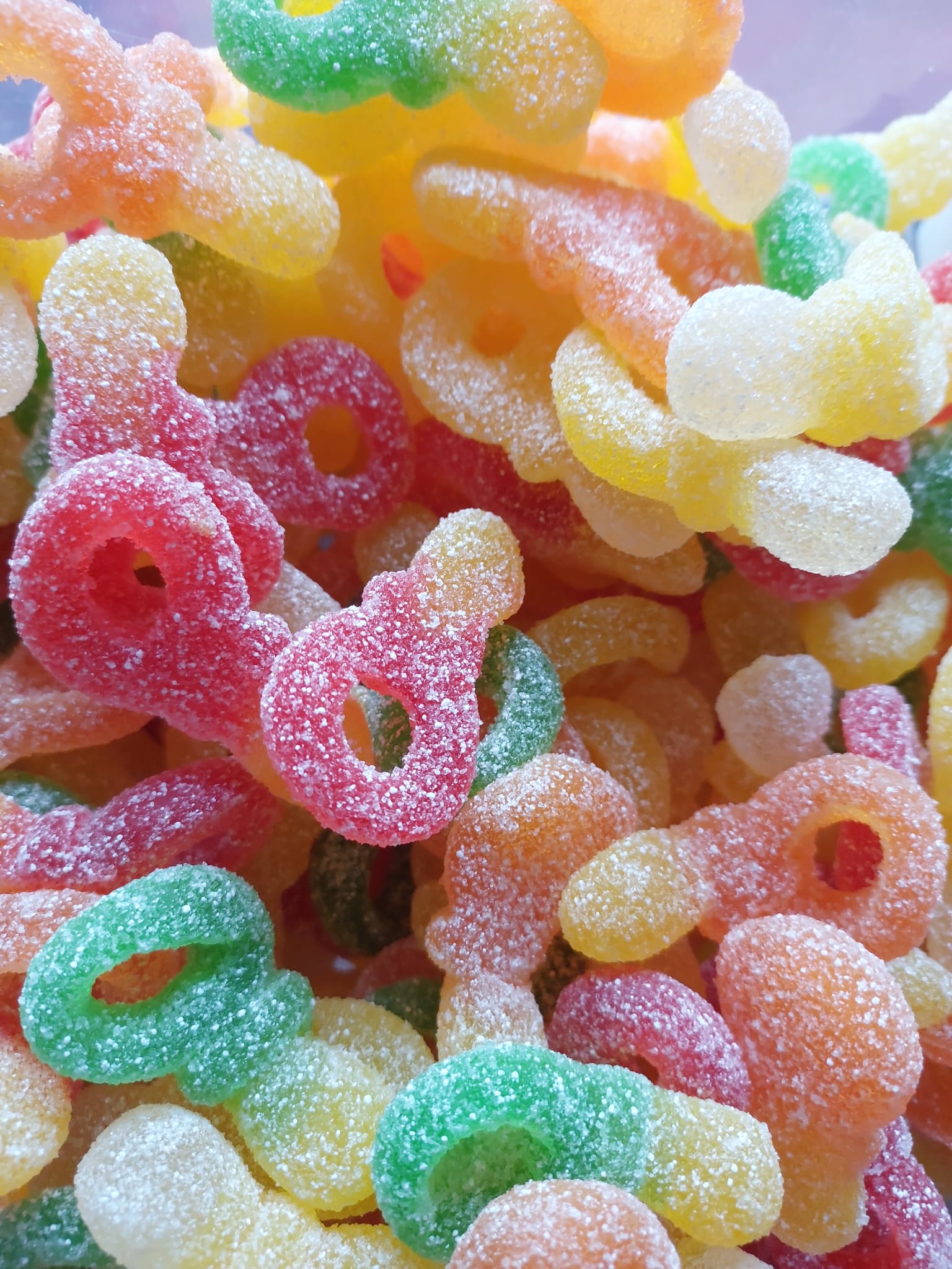 Ingrédients : Sirop de glucose, sucre, eau, gélatine de boeuf halal, amidon modifié de pomme de terre, acidifiants : E330, E270, E296, correcteur d’acidité : malate de sodium, arôme, colorants E100, E163, E129, E160a(I), E133. Sans Gluten.